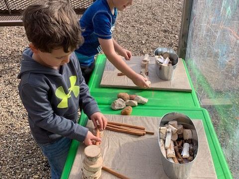 Sensory activities that include planting a garden that children can water, touch, and smell. We will have a playhouse, sand area, wood play kitchen with pots/pans/spoons and access to water, and so much more. Natural wood benches and stumps for children to have moments of rest with their friends as they socialize about their adventures on the playground.